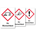 Unsere GHS-Piktogramme mit Wunschtext vereinen zwei entscheidende Vorteile: Sie erfüllen die gesetzlichen Anforderungen der CLP-Verordnung und ermöglichen gleichzeitig eine flexible, auf den konkreten Verwendungszweck zugeschnittene Beschriftung. Ob Gefahrstoffname, UN-Nummer, Sicherheitshinweise oder weitere interne Informationen – der Aufdruck lässt sich bedarfsgerecht anpassen.