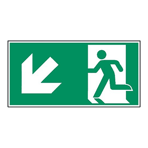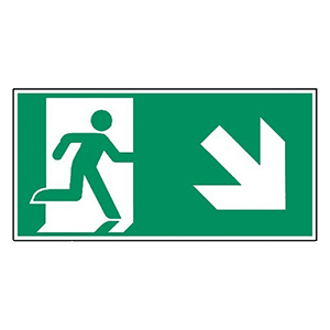 Notausgang abwärts quer rechts Schild | ![]() | Schräg abwärts nach rechts: Etagenwechsel kombiniert mit einer Richtungsänderung nach rechts. |