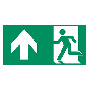 Notausgang geradeaus Schild | ![]() | Pfeil nach oben: geradeaus weitergehen (ggf. durch eine Tür hindurch oder eine Treppe hinauf). |