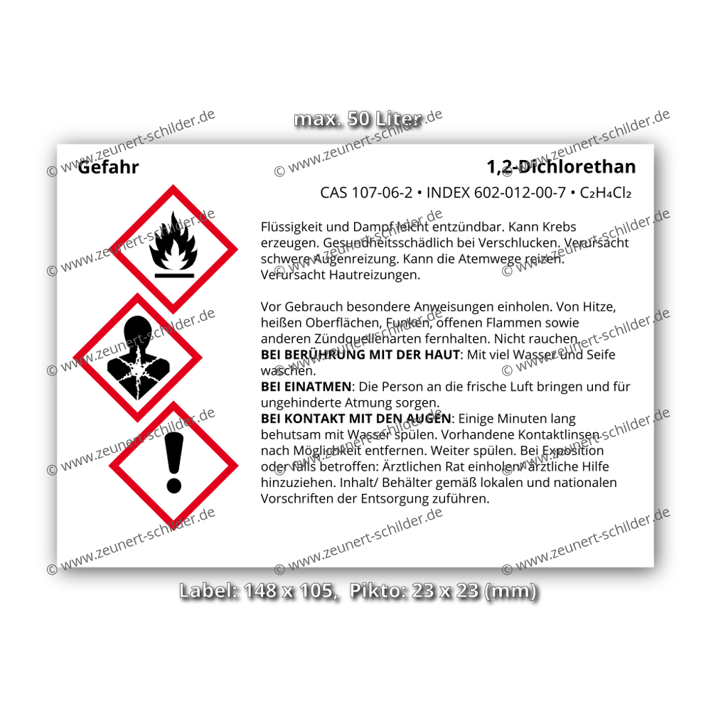 | über 3 Liter bis höchstens 50 Liter | mindestens 105 x 74 mm | mindestens 23 x 23 mm |