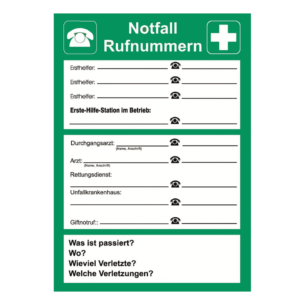 Aushang für interne und externe Notrufnummern (112, 110, Leitwarte, Sicherheitsdienst) mit beschreibbaren Feldern.