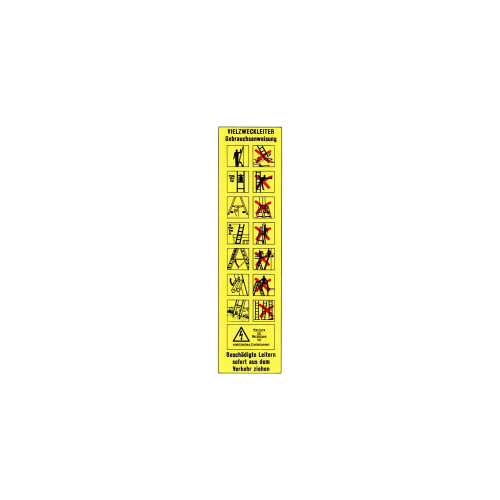Aushang mit Richtlinien für den sicheren Umgang mit Leitern: Prüfung vor Benutzung, Aufstellwinkel, Sicherung, Lastgrenzen und verbotene Anwendungen. Ideal für Werkstätten, Lager und Baustellen.