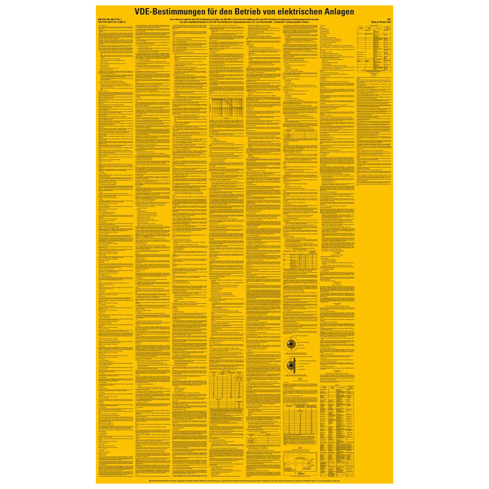 Gelber Aushang mit VDE-Bestimmungen für elektrische Anlagen. Das signalstarke Design sorgt für schnelle Wahrnehmung, das große Format verbessert die Lesbarkeit. Ideal für Sicherheitsbereiche und Elektro-Arbeitsplätze.