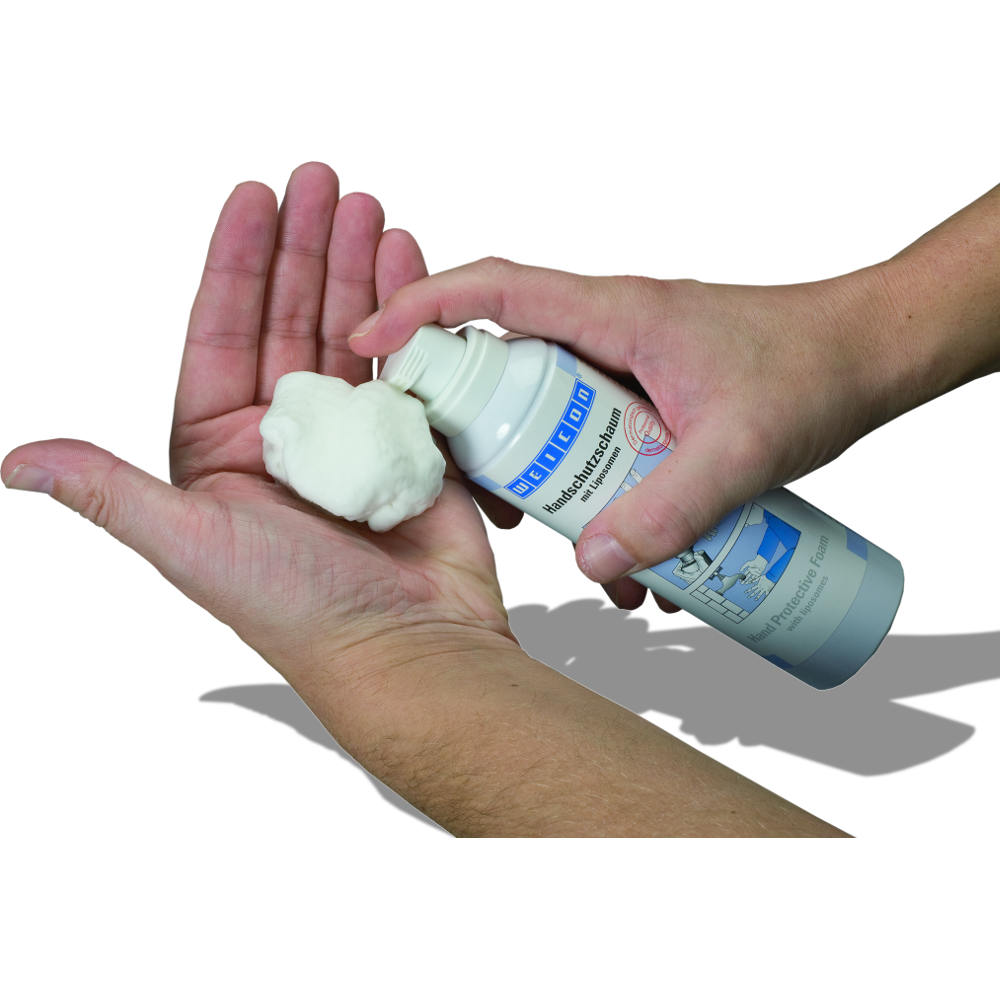 WEICON Handschutzschaum bildet einen fettfreien, unsichtbaren und wasserfesten Schutzfilm, der Verschmutzungen verschiedenster Art nicht in die Haut und Poren eindringen lässt. Dieser „unsichtbare Handschuh“ schützt gegen Schad- und Reizstoffe aus aggressiven chemischen Substanzen.